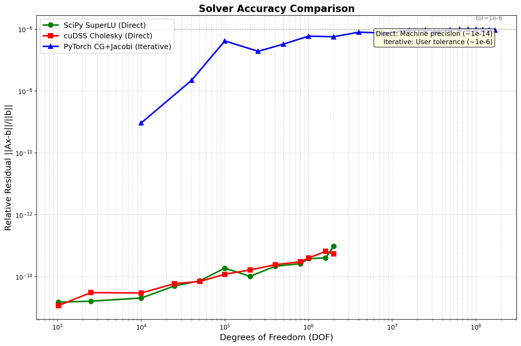 Trade-off: Direct solvers achieve machine precision (~1e-14), iterative achieves ~1e-6 but is 100× faster.