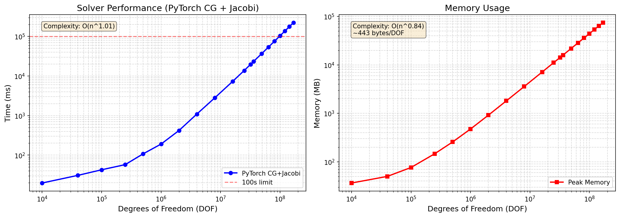 Key Finding: PyTorch CG+Jacobi achieves 100× speedup over direct solvers at 2M DOF and is the only solver that scales to 169M DOF.