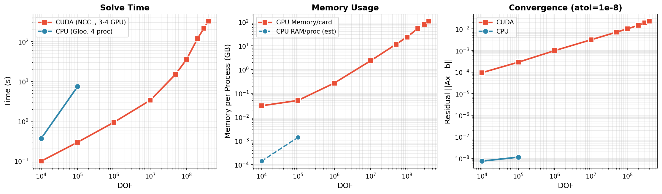 - Scales to 400M DOF: 330 seconds on 3× H200 GPUs (110 GB/GPU)